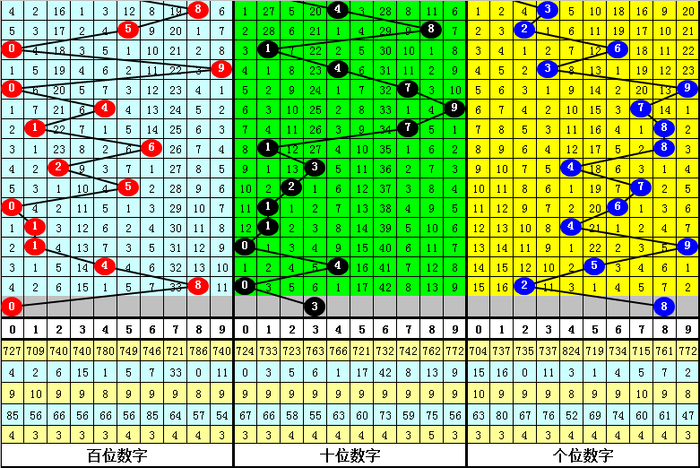 跨度分析:最近5期分手开出跨度:6、3、9、1、8,本期防跨度8重迭开出。