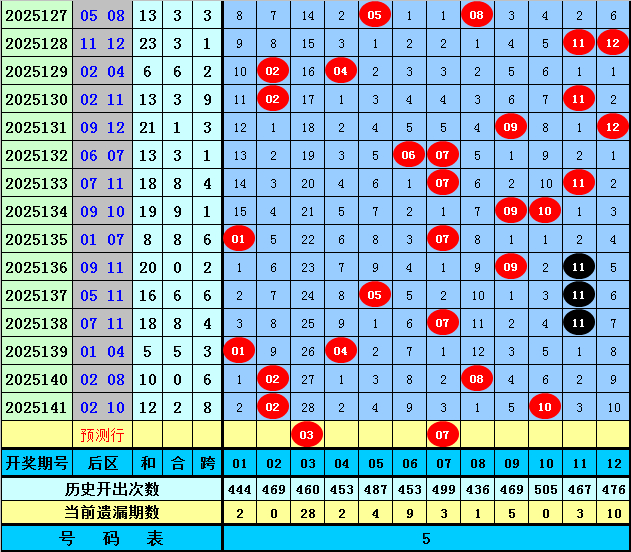 后分歧析:上期后区开出奖号02和10,在最近50期开奖中,后区奖号012路落号比为25:35:40,前10期后区012路落号比为3:9:8,本期后区存眷号码01、02、03、07、11,两码参考03、07。