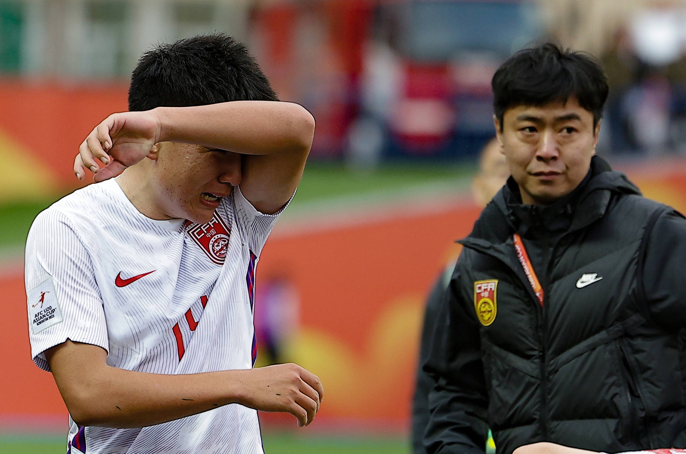 2023年3月12日,中国队球员徐彬(左)在比赛后。当日,在乌兹别克斯坦塔什干举行的2023年U20男足亚洲杯四分之一决赛中,中国队以1:3不敌韩国队,无缘四强。新华社发(车周勇摄)当作中场要害,徐彬在场上承担了更多攻防调度的任务。他给我方在本届亚洲杯的阐扬打了85分。“对球处分上比过去稳了一些,但详情还有不及。”