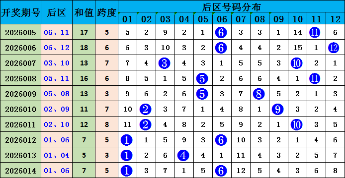 后远离析:大乐透后区上期开极度偶组合,跨度5。近10期后区奇偶组合出现5期,偶奇组合出现2期,奇奇组合出现1期,偶偶组合出现2期;近10期后区两码跨度1-5开出5次,6-11开出5次,本期后区两码详细保举:01、09。